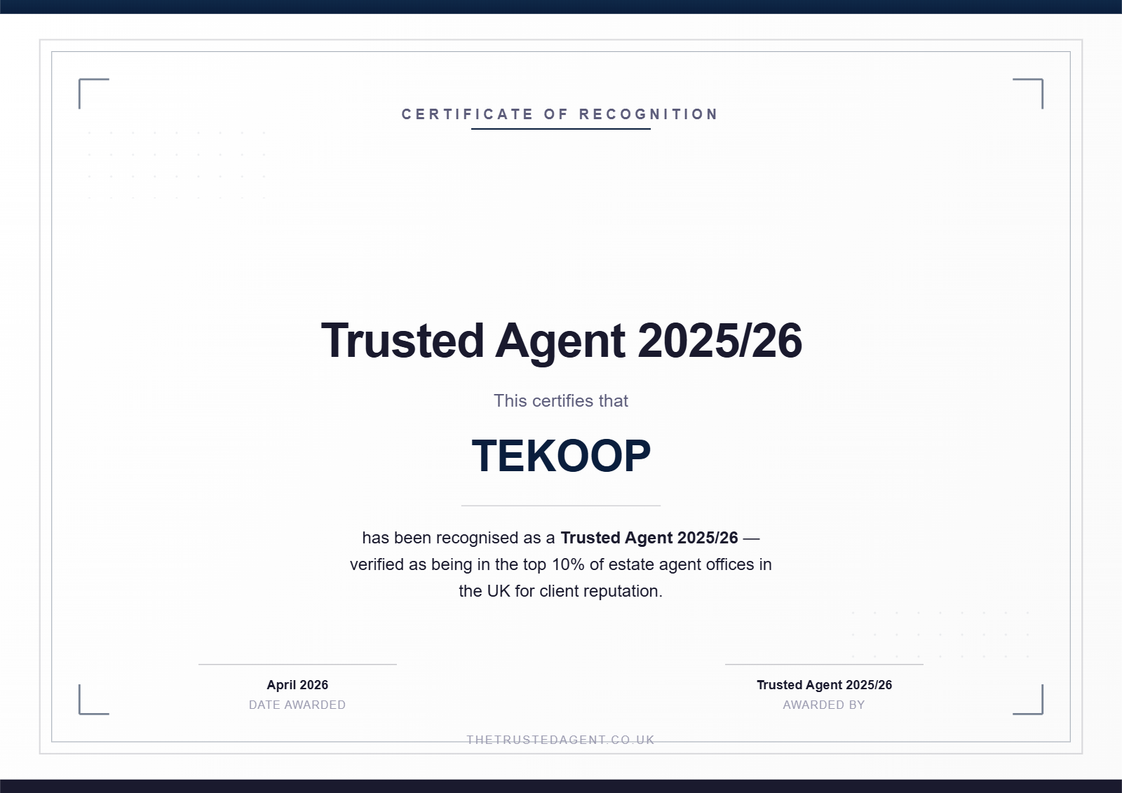 TEKOOP has been named a Trusted Agent 2025/26, placing it among the top 10% of estate agent offices in the UK for client reputation. The recognition was awarded by Kerfuffle, the estate agency industry's supplier discovery platform, and powered by independent data from ViewAgents.